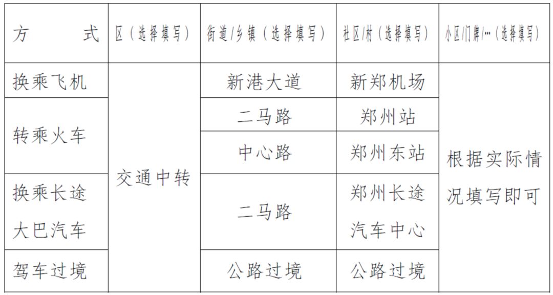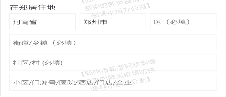 按照实际情况填写﹝区﹞、﹝街道/乡镇﹞、﹝社区/村﹞、﹝小区/门牌号﹞等信息。2.郑州有居住地但入郑之后在单位宿舍、门店等地方居住或隔离的按照实际情况填写单位宿舍、门店等地址,﹝区﹞、﹝街道/乡镇﹞、﹝社区/村﹞等所属区划可借助互联网地图(高德、百度)搜索,如查询不到具体地址信息,可填写相近的地址信息,﹝门店/企业﹞需注明门店或企业的名称和具体地址。3.郑州无居住地,来郑州出差或者就医等其他短期停留的按照实际情况填写医院、酒店等地址,﹝区﹞、﹝街道/乡镇﹞、﹝社区/村﹞等所属区划可借助互联网地图搜索(高德、百度),如查询不到具体地址信息,可填写相近的地址信息,﹝酒店/医院﹞需注明酒店或医院的名称和具体地址。4.郑州无居住地,为过境人员,如换转乘飞机/火车/长途大巴、公路过境的